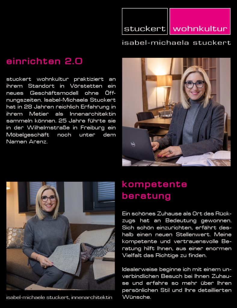 Als Innenarchitektin mit langjähriger Erfahrung biete ich für meine Kundinnen und Kunden aus Freiburg und Umgebung eine umfassende Einrichtungsberatung an, ebenso den Verkauf ausgesuchter Möbel.